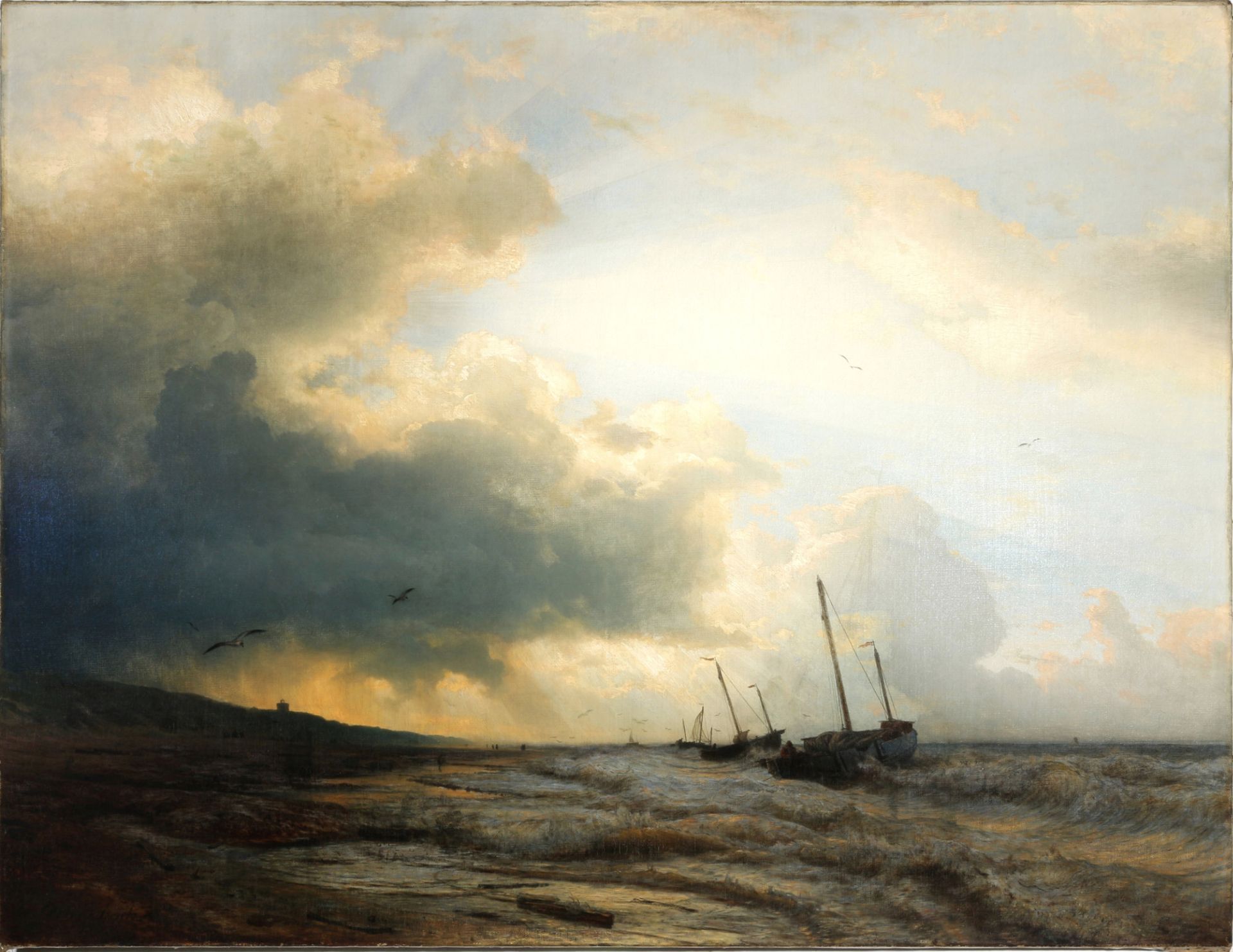 Andreas Achenbach (1815-1910) stürmische Küstenlandschaft 1858Öl/Leinwand, u. links signiert und datiert A. Achenbach 1858, stürmische holländische Seelandschaft mit Segelbooten, H 107 cm x B 137 cm, Rahmen 125,5 x 156 cmLimit 1.800,- EUR