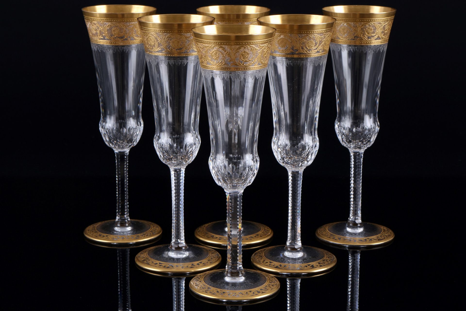 in unserer kommenden AuktionLos 738St. Louis Thistle Gold 6 Champagnerflöten, Kristall, Frankreich, Serie Thistle Gold, mit Ätzmarke, 6x H 19 cm x D 6 cmLimit 300,- EUR