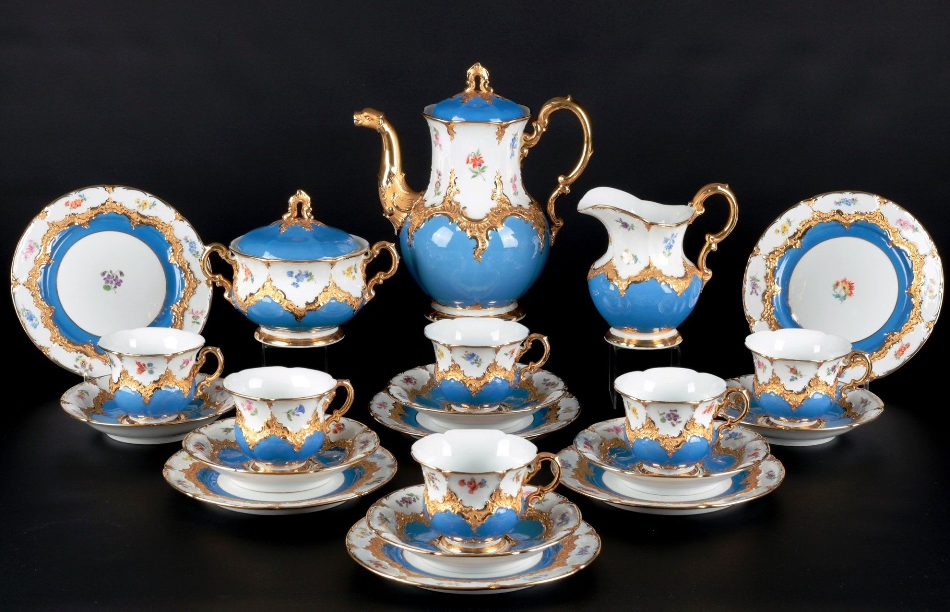 Meissen B-Form Hellblau Streublümchen Kaffeeservice für 6 Personen 1.Wahl, 21-teiliges Porzellan, blaue Schwertermarke 1. Wahl, B-Form Hellblau Vollgold, unbeschädigtLimit 4.000,- EUR