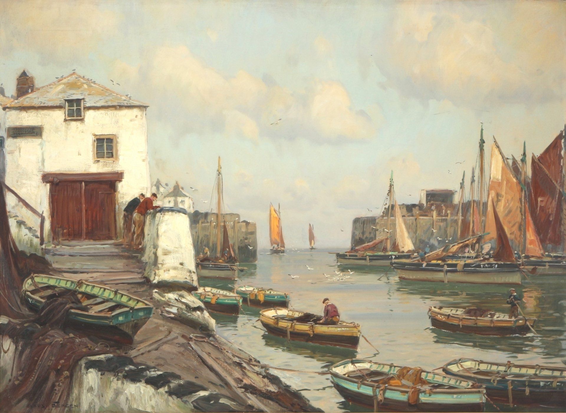 in unserer kommenden AuktionLOS 575Claus Bergen (1885-1964) Englisches Fischerdorf, Öl/Leinwand, u. links signiert Claus Bergen, Hafenansicht eines kleinen Fischerdorfes, H 81 cm x B 110 cm, Holzrahmen 98 x 128 cm,Limit 800,- EUR